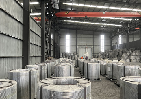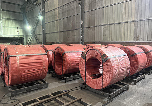 The coils are bundled with steel strips, wrapped in three layers of film, and then placed either horizontally or vertically on iron frames and pallets for shipping.